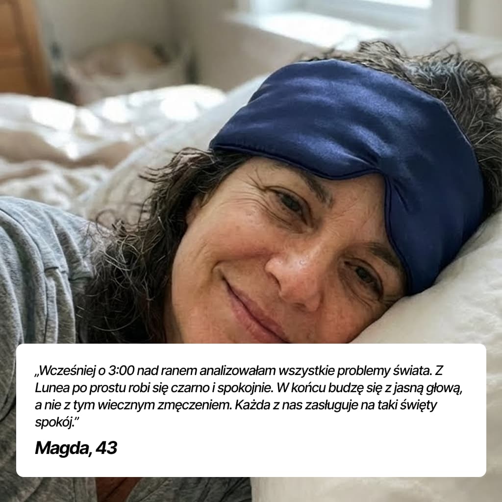 "Myślałam, że moje zmęczenie to kwestia wieku. Myliłam się. To było światło. Lunea działa jak wyłącznik, zakładam i odpływam w 10 minut. Rano w końcu wstaję z naładowaną baterią i pełna energii. Warta każdej złotówki."